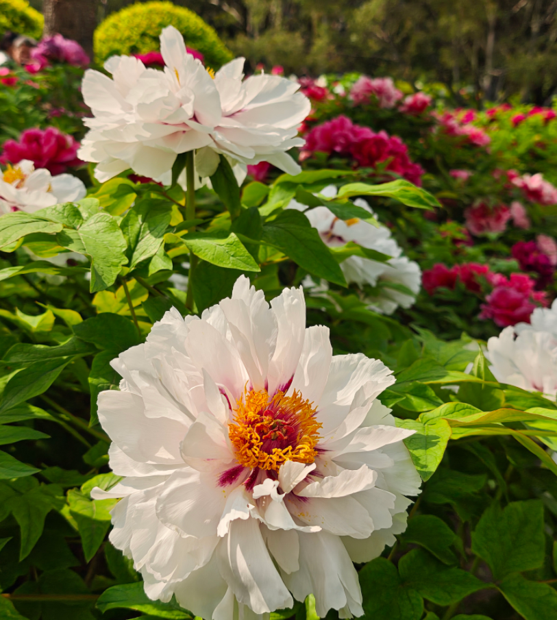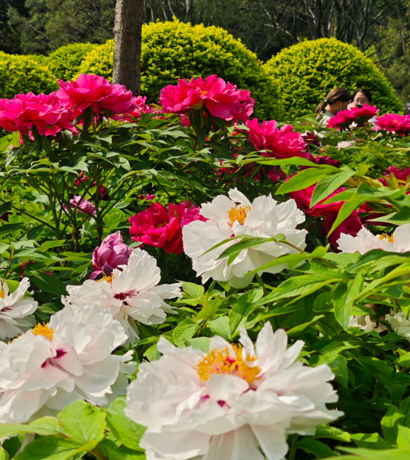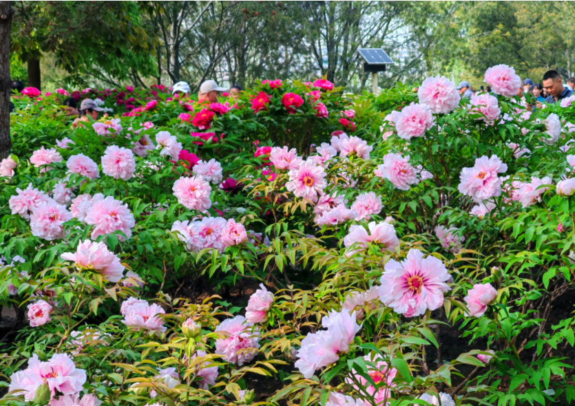 园里共汇集150余个品种的牡丹,超6000株牡丹,包括豆绿、赵粉、魏紫、姚黄等名贵品种,花色涵盖红、粉、白、紫、黄等多种色彩。